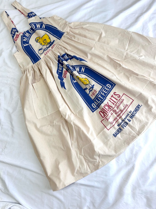 フィードサックワンピース サイズS 着丈118cm 身幅44cm ウエスト44cm ひよこのフィードサックワンピース。 ちょっとかすれたヴィンテージ な雰囲気が あります。 冬はスウェットやニットなど 夏はTシャツなど オーガニックコットンなので一年中 着用できます^^