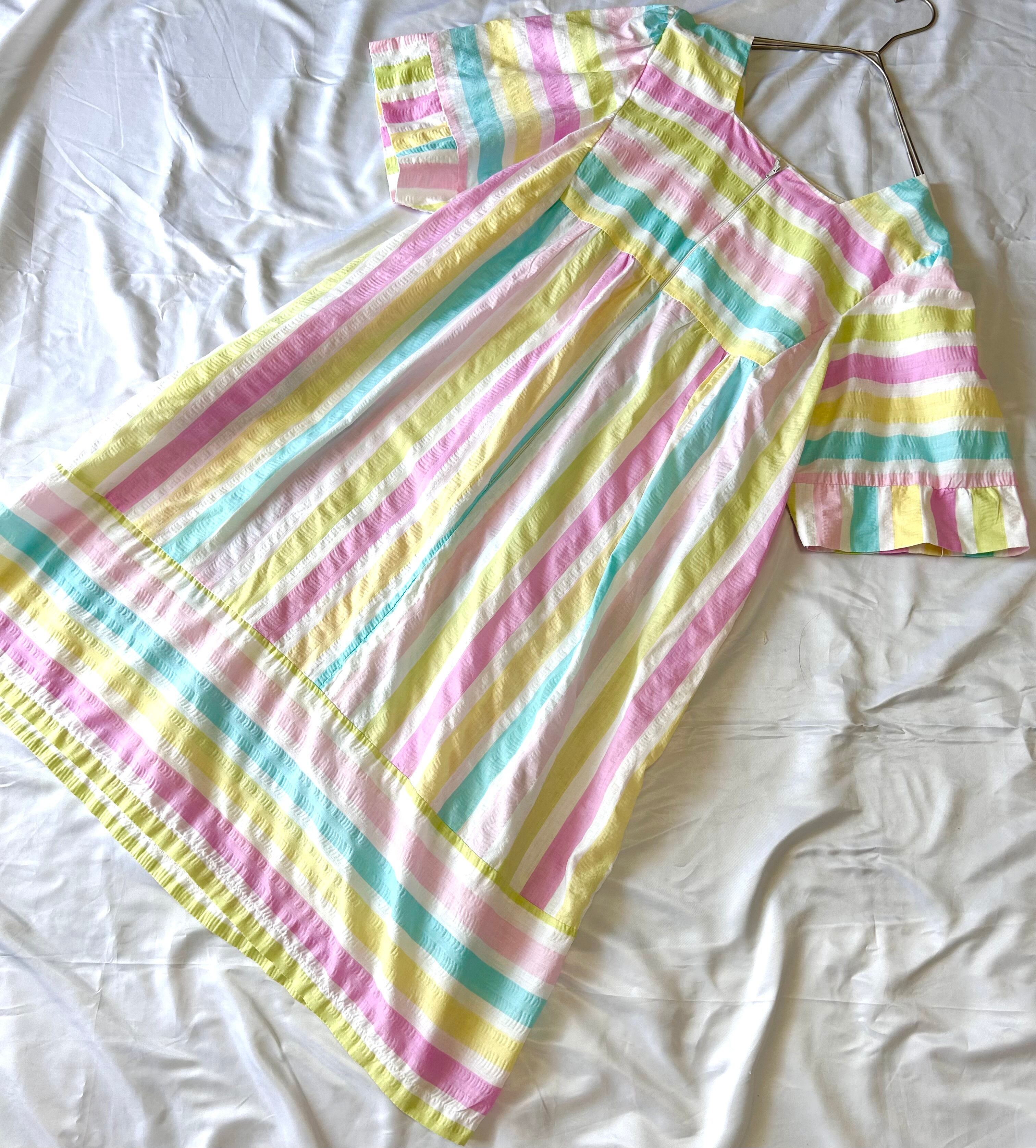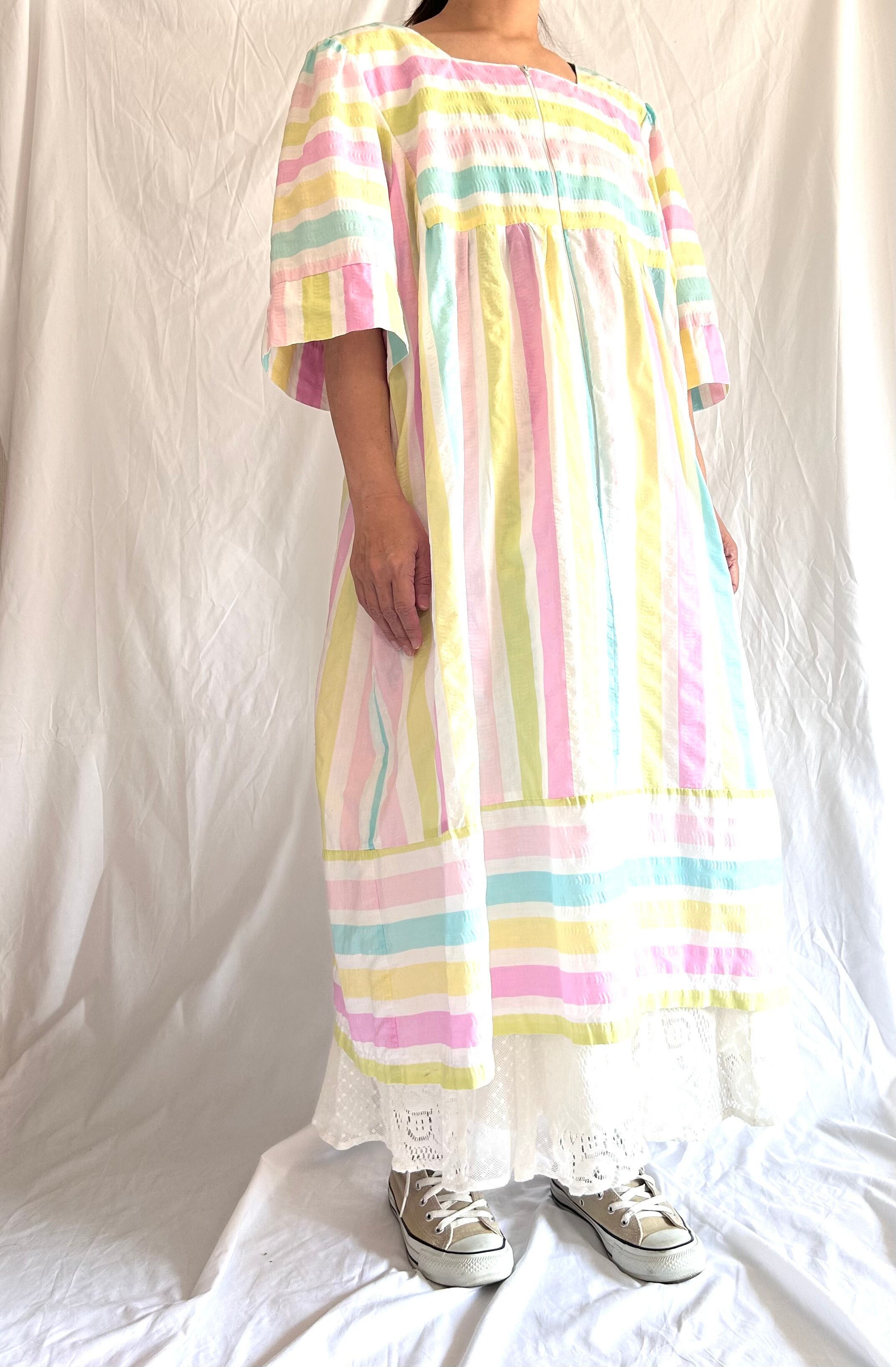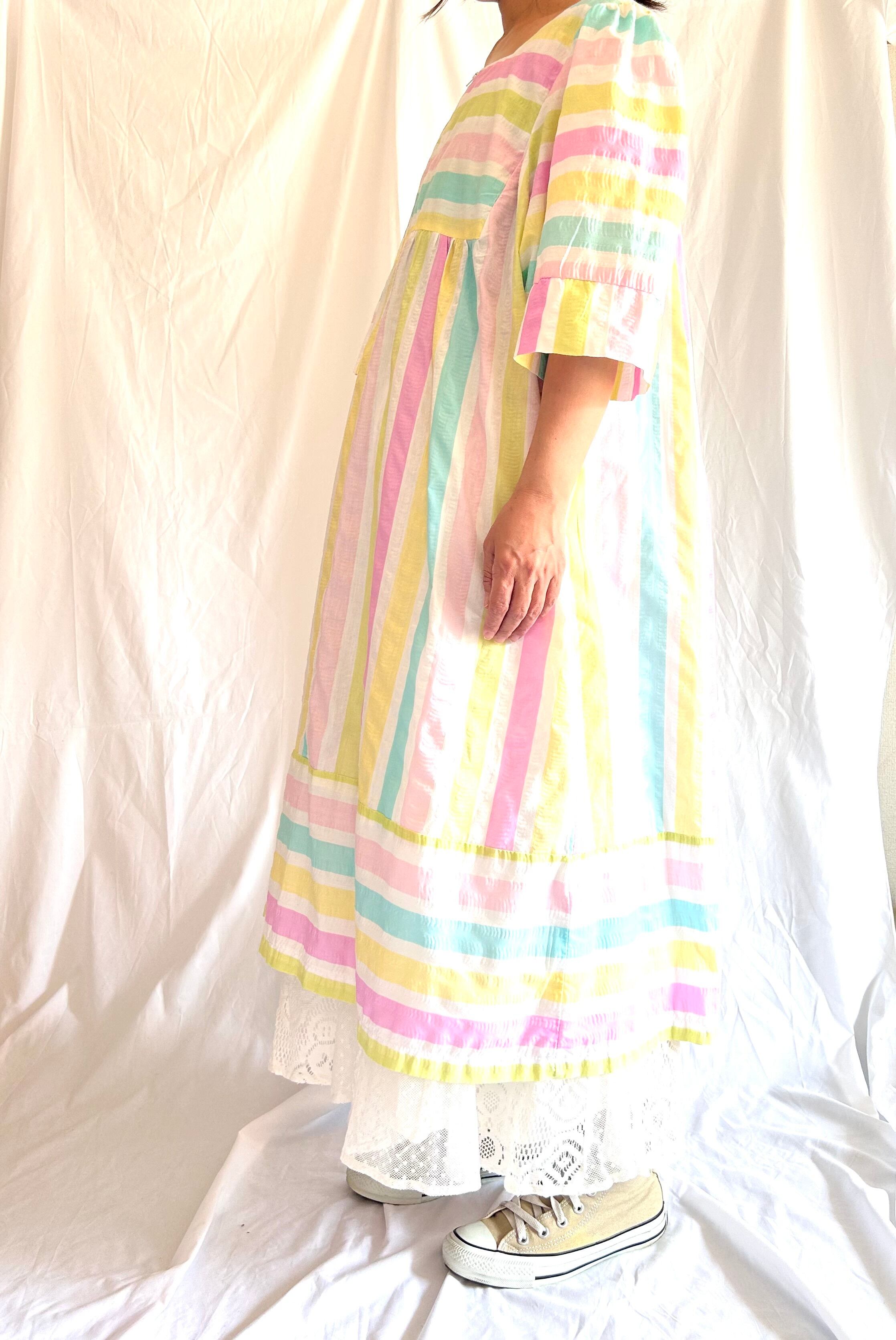 カラフルストライプワンピース サイズF 肩幅42cm 身幅60cm 着丈110cm パステルカラーのストライプワンピース。 ポケットも付いて便利です。