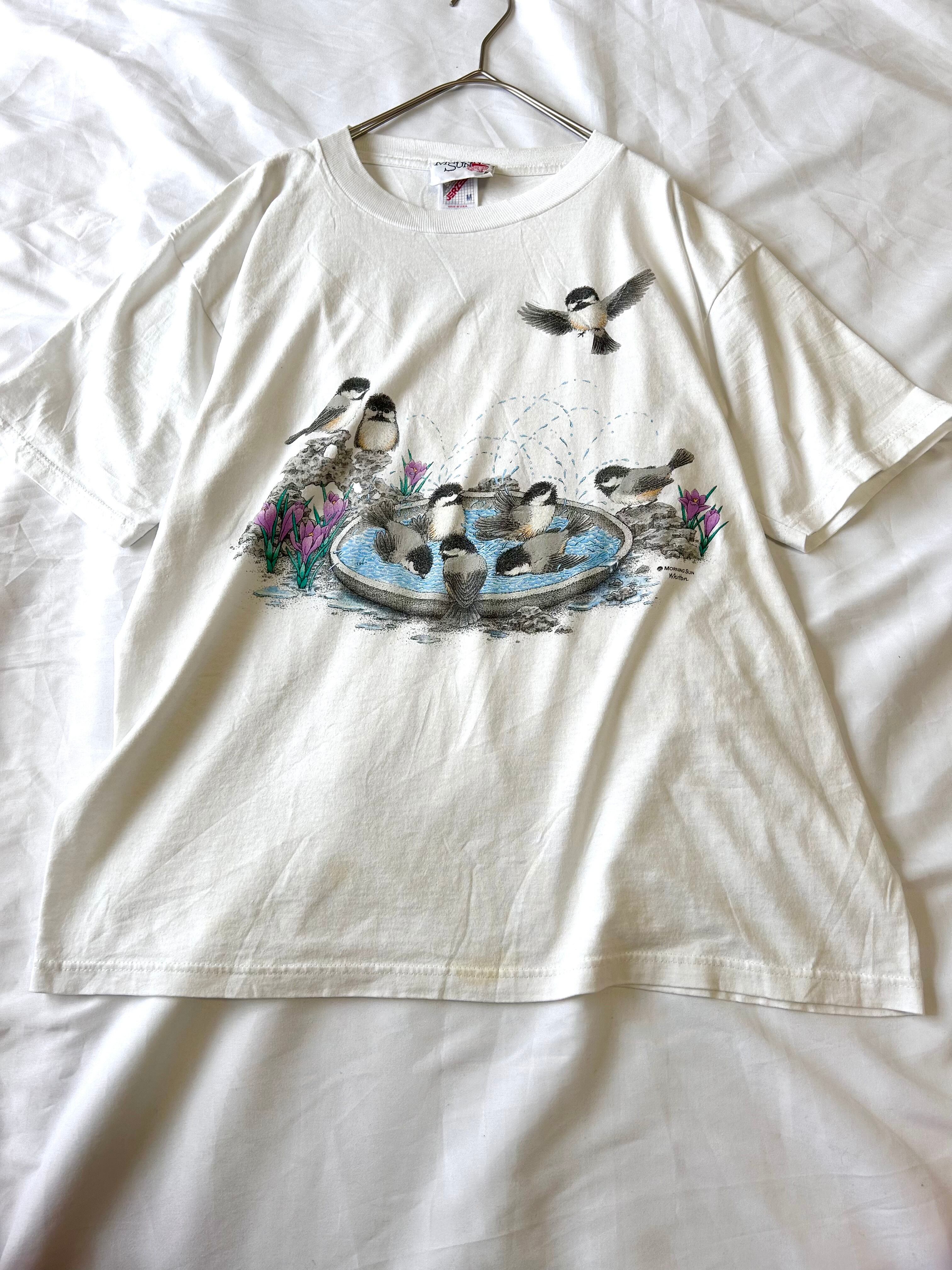 スズメプリントTシャツ サイズM 肩幅48cm 身幅54cm 着丈59cm 可愛いスズメのプリントTシャツです。 水浴び姿が可愛いです^ ^ 裾のあたりにシミがございます。 画像でご確認ください。