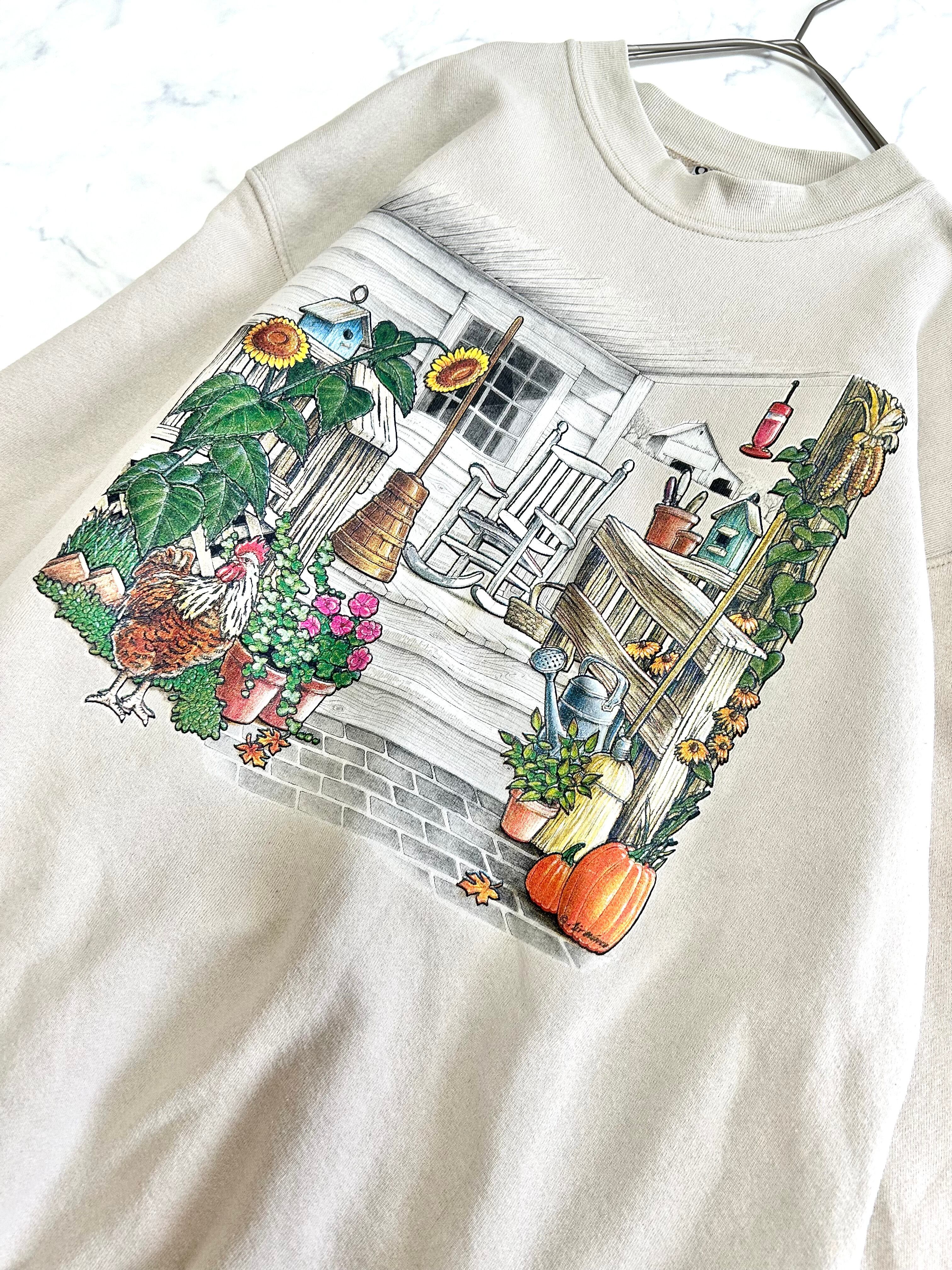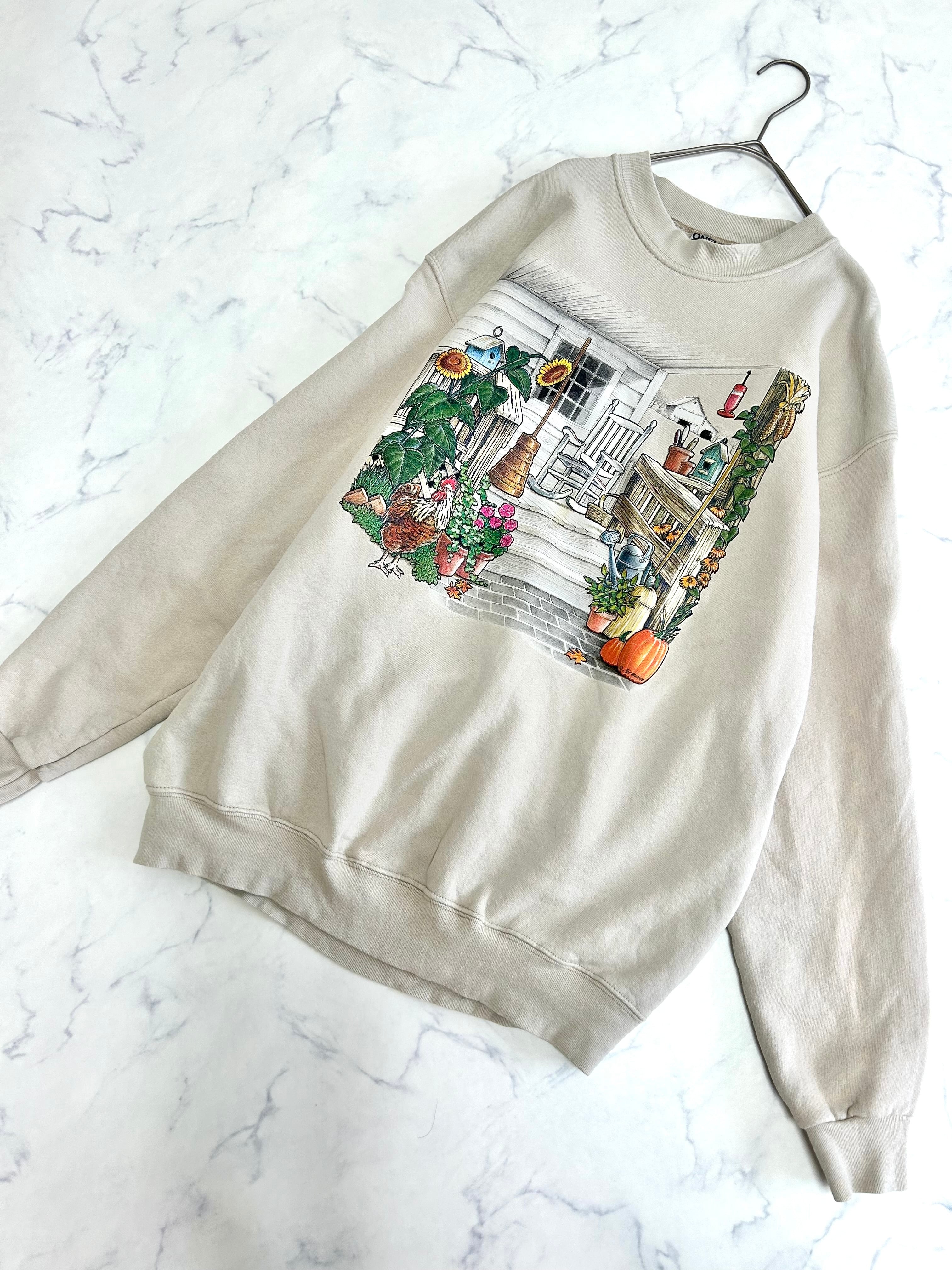 オニータ カントリーなスウェット サイズXL 肩幅55cm 身幅58cm 着丈70cm 袖のあたりに色褪せ?漂白したようなシミがございます。