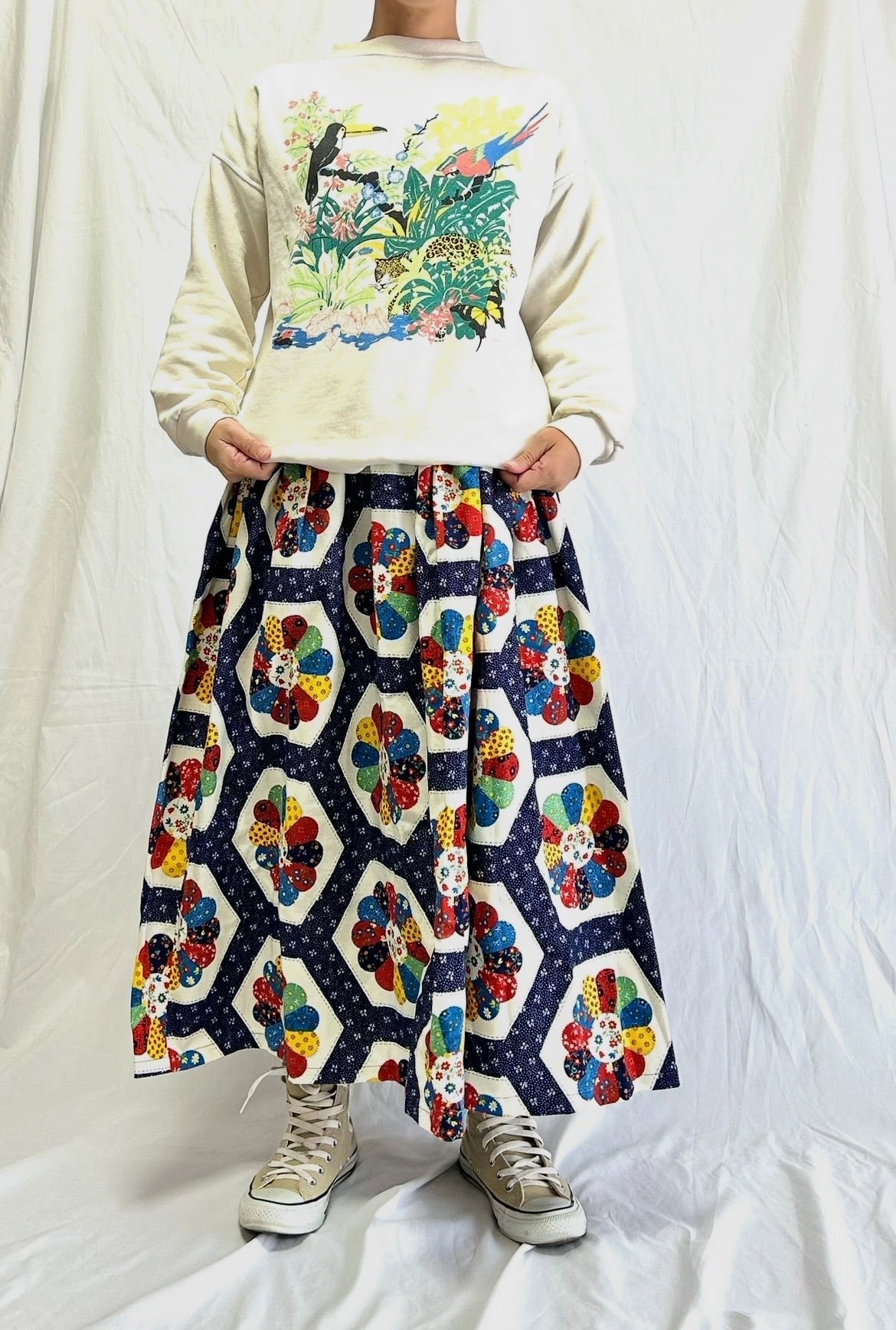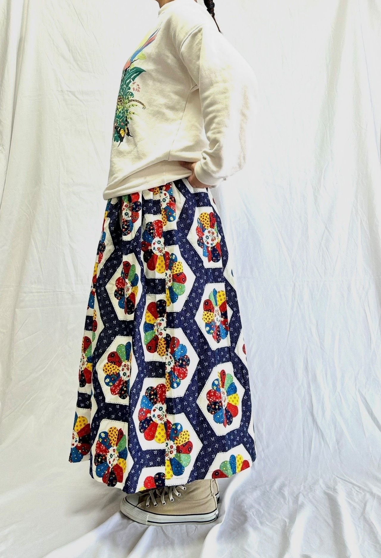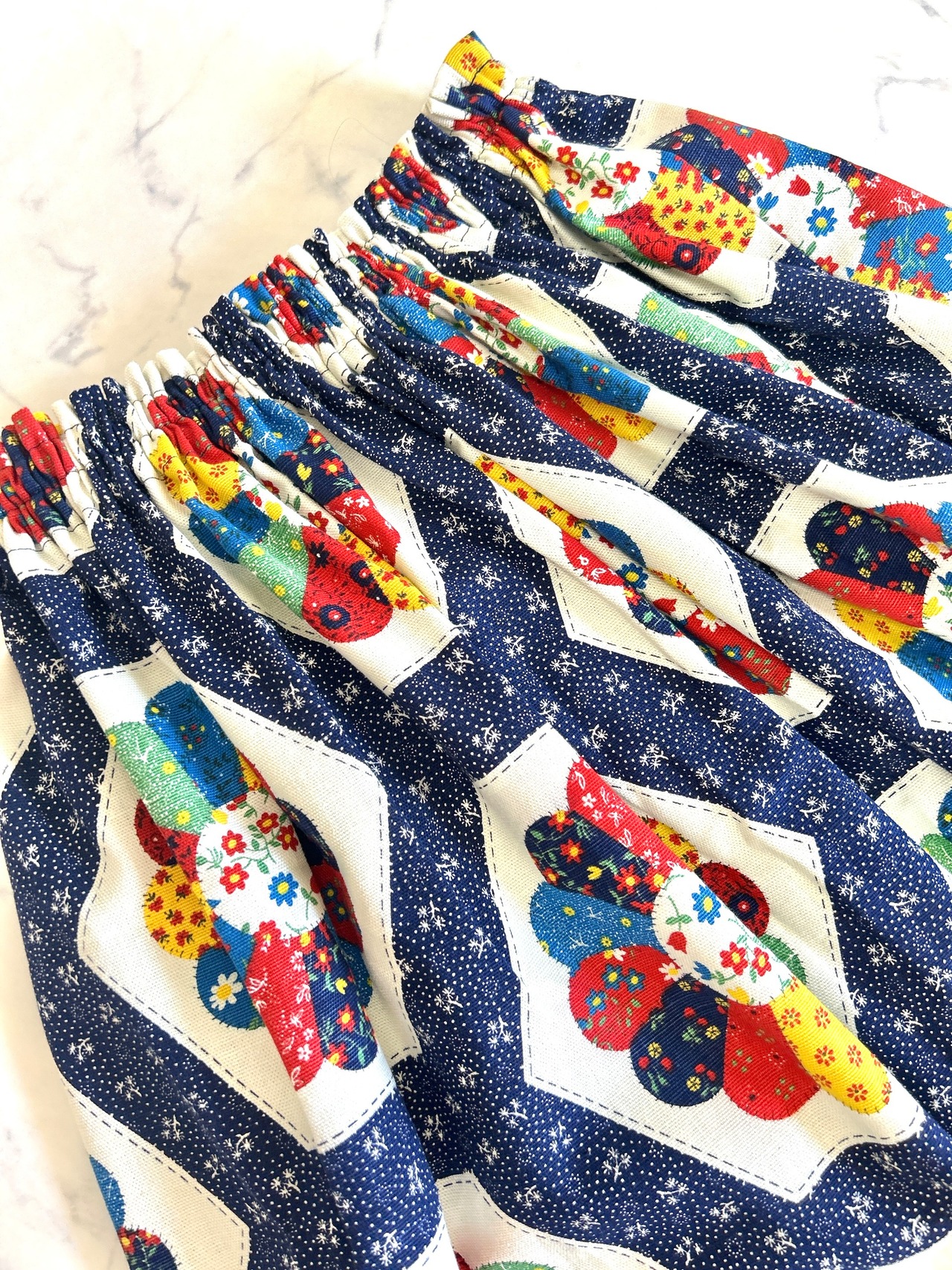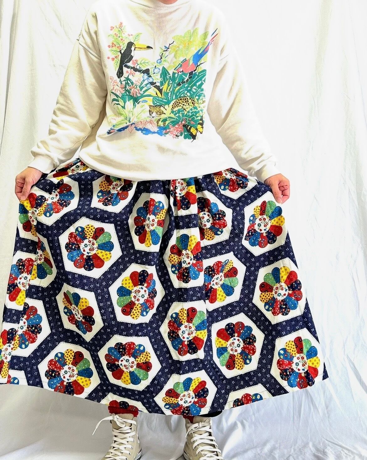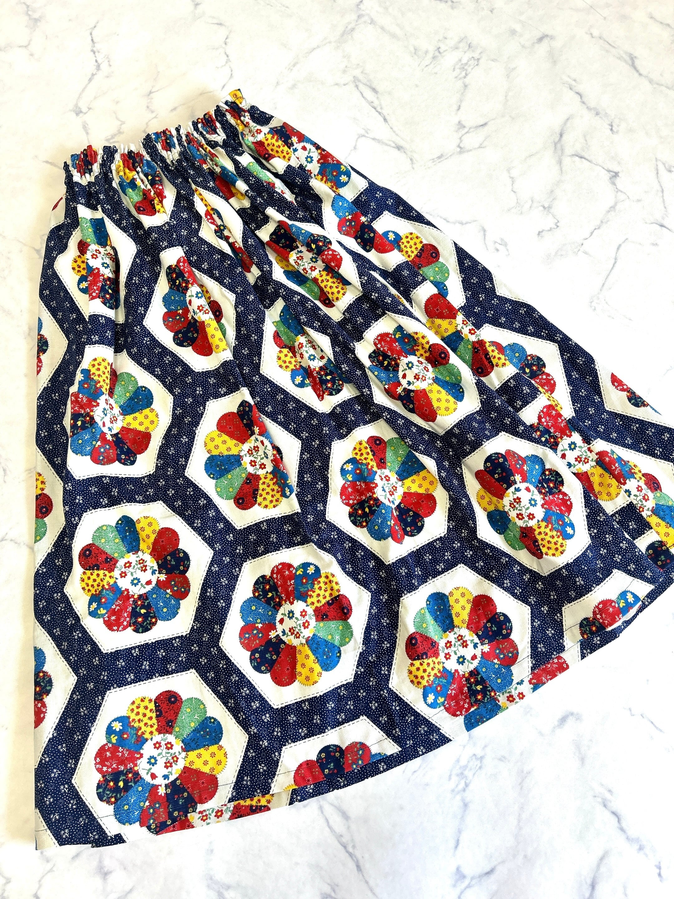 ドレスデンスカート サイズF ウエスト25〜60cm 総ゴム 着丈81cm 平置きサイズ ※158cm着用 ヴィンテージ のドレスデン生地で作りました。 カラフルでどんなお洋服にも合わせやすいです。
