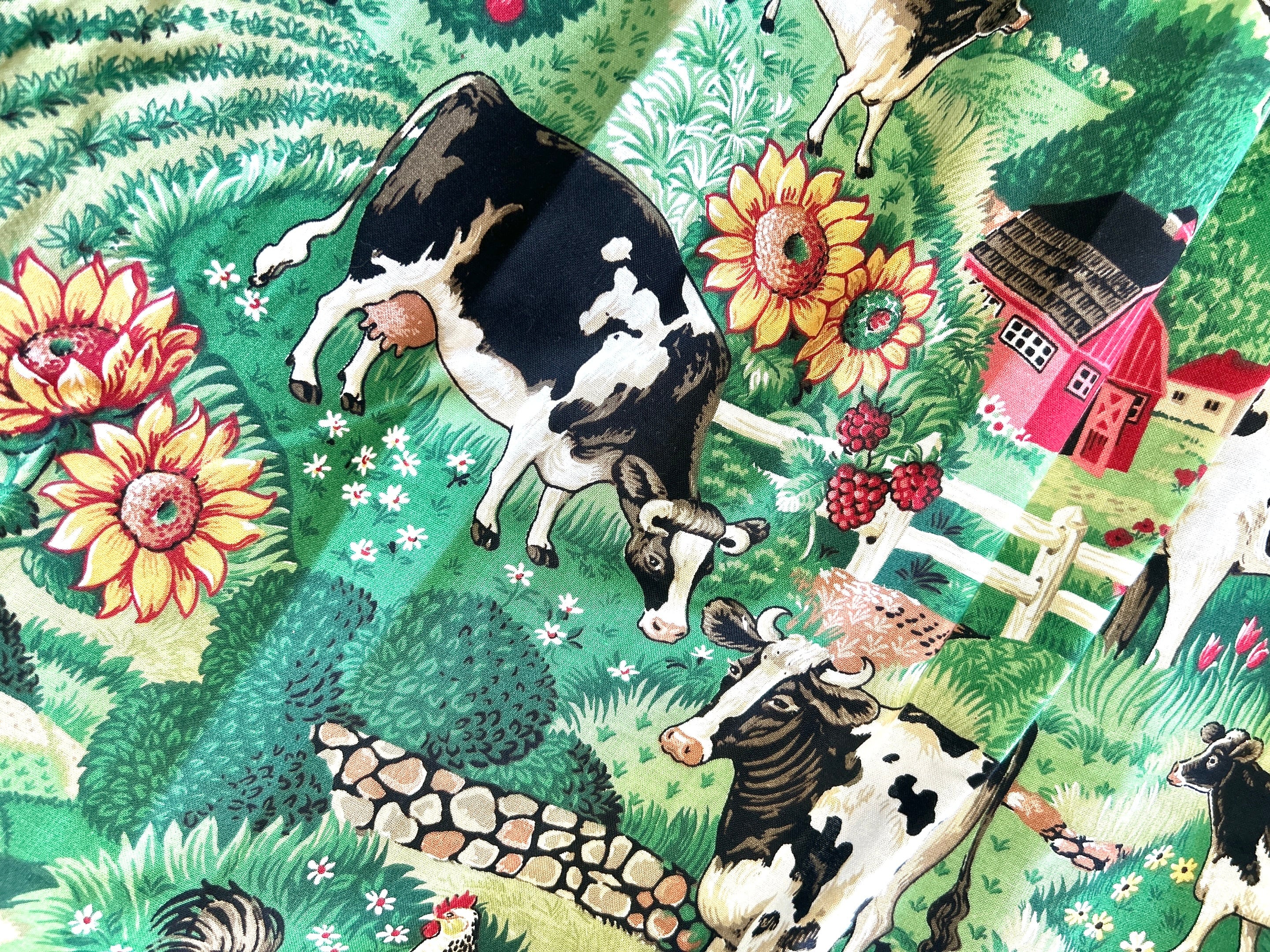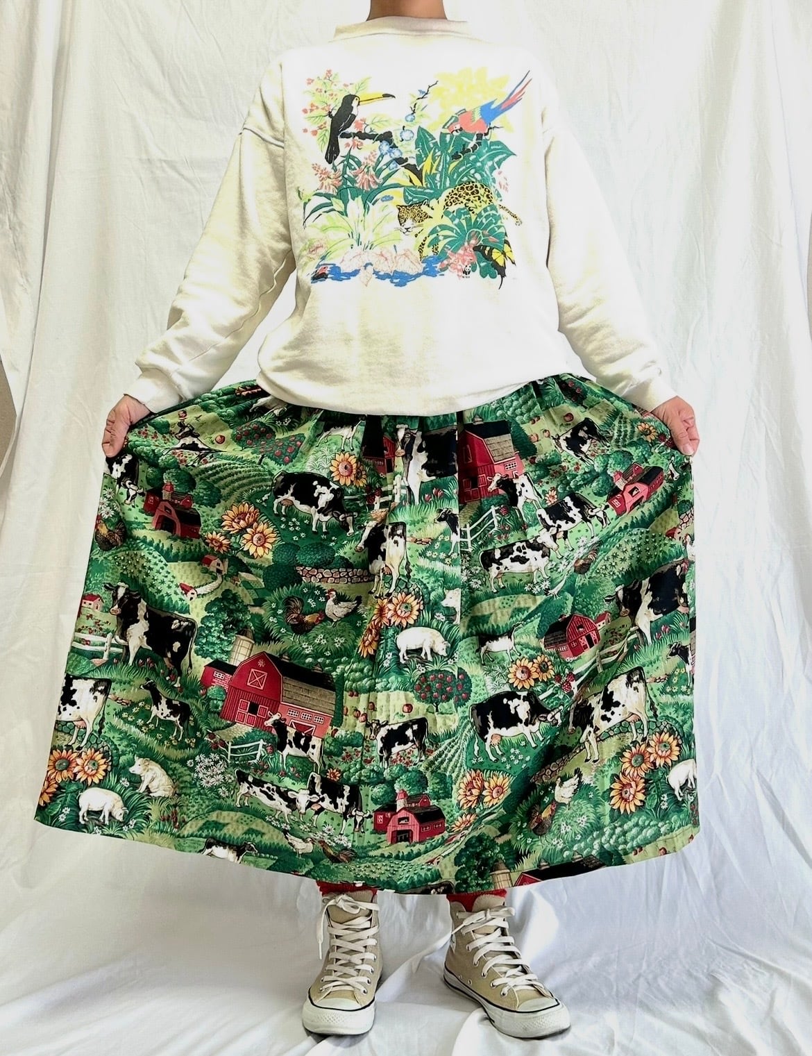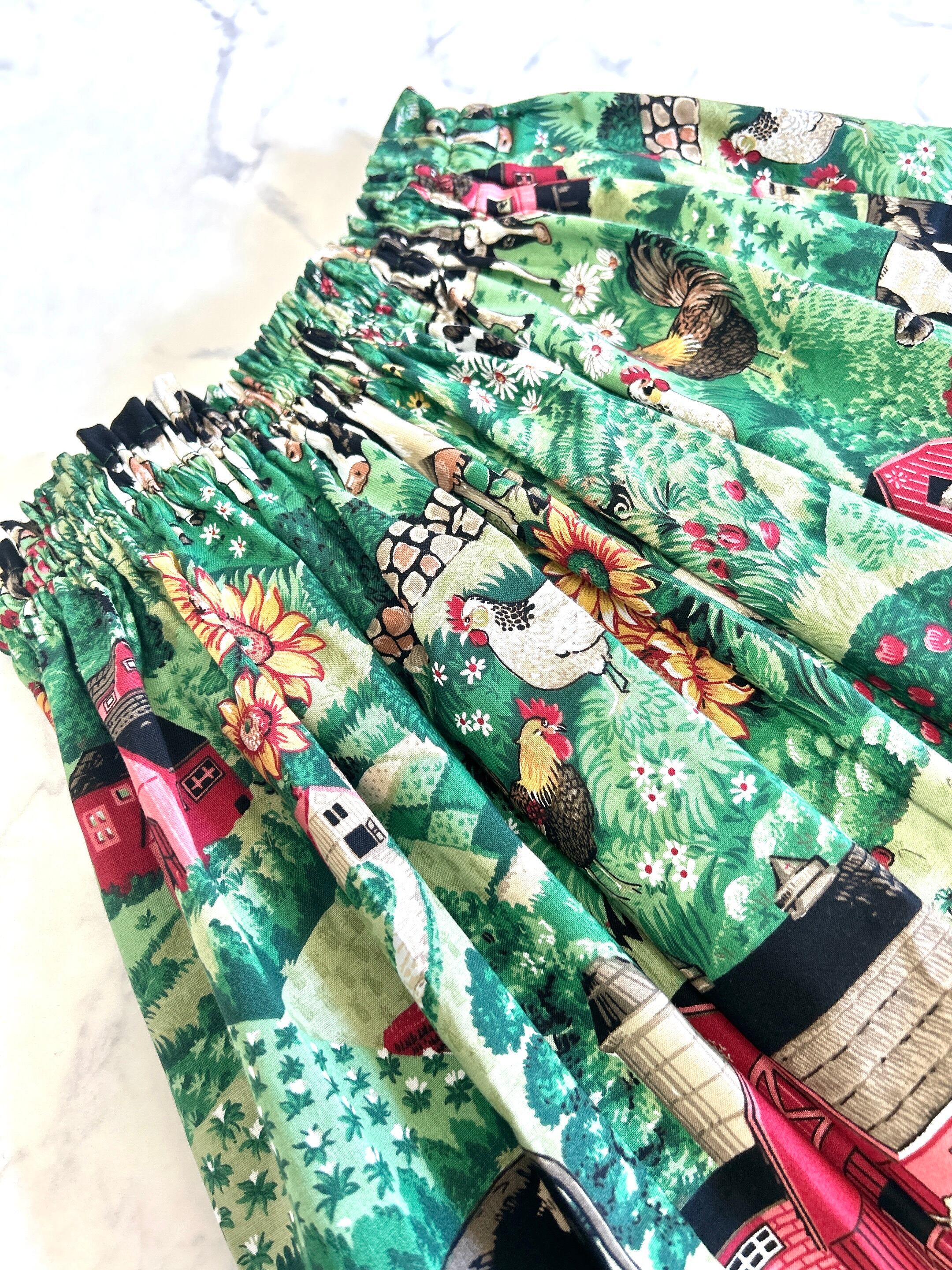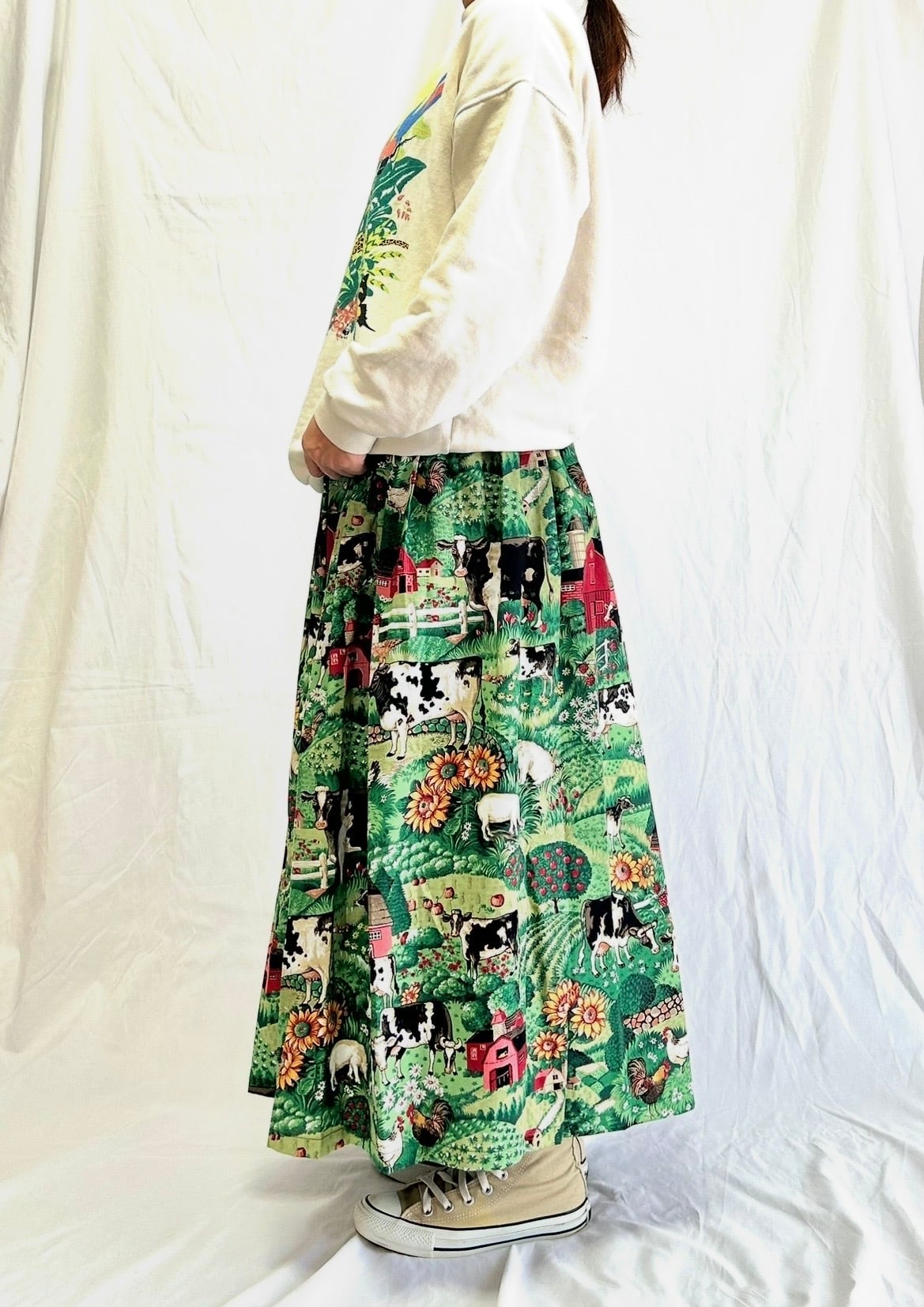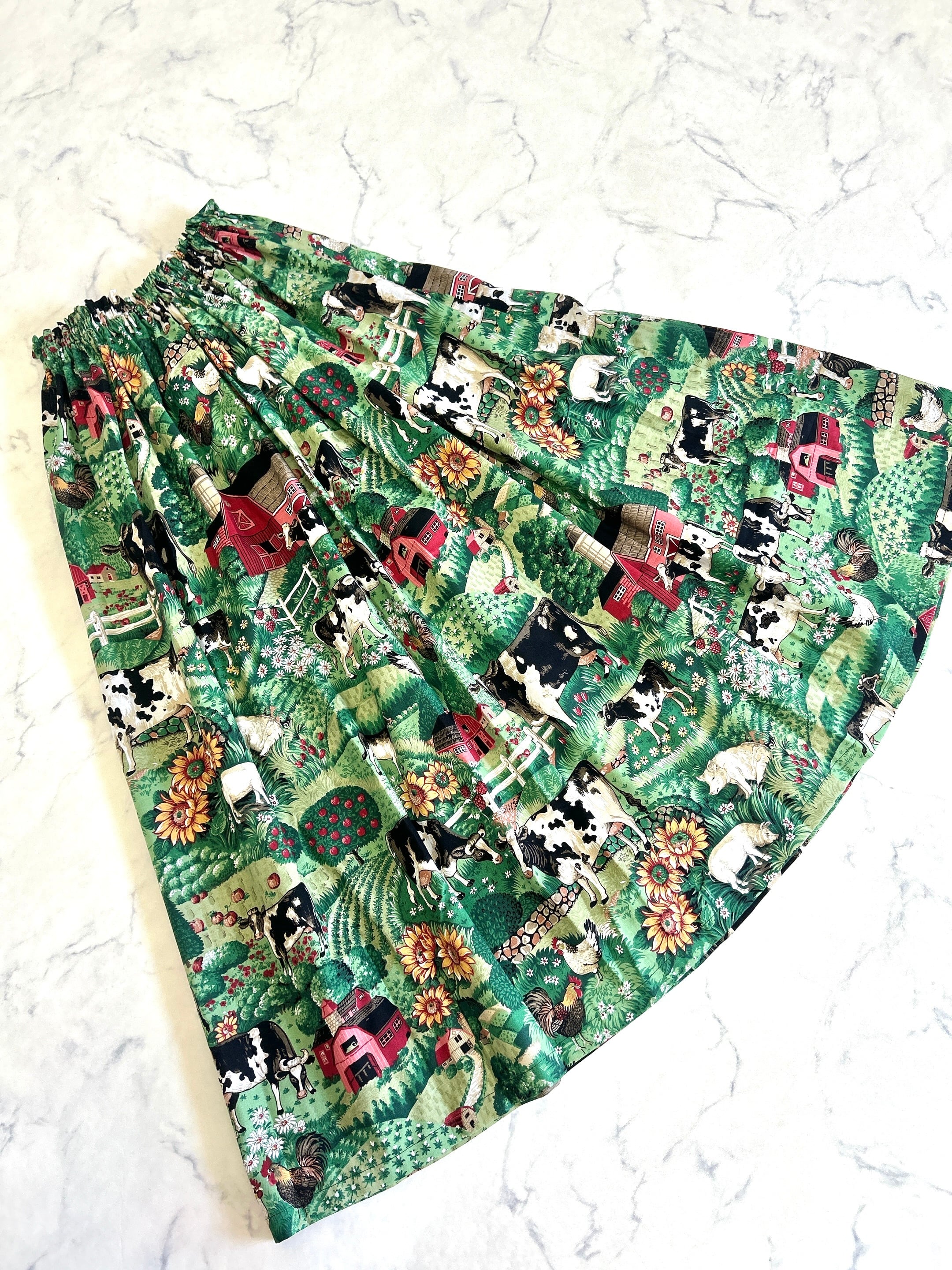 ファームスカート サイズF ウエスト25〜60cm 総ゴム 着丈84cm 平置きサイズ ※158cm着用 毎回人気の牛柄さん 希少なヴィンテージ 生地でお作りいたしました。