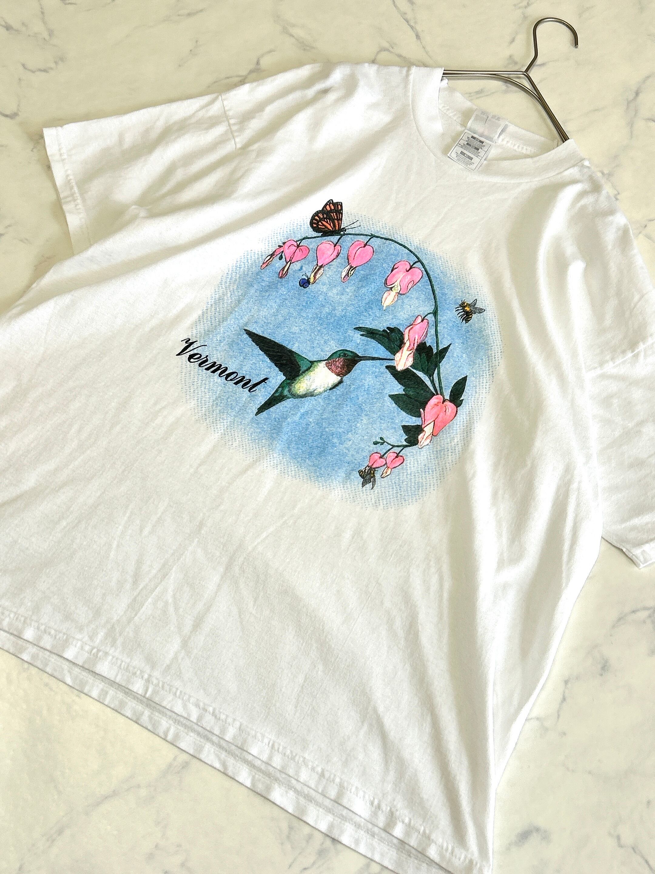 ハチドリのTシャツ サイズXL 肩幅56cm 身幅58cm 着丈65cm 可愛らしいプリントTシャツ タグに破れがございます。 多少の使用感はございますが 古着にご理解ある方なら気にならないかと 思います。