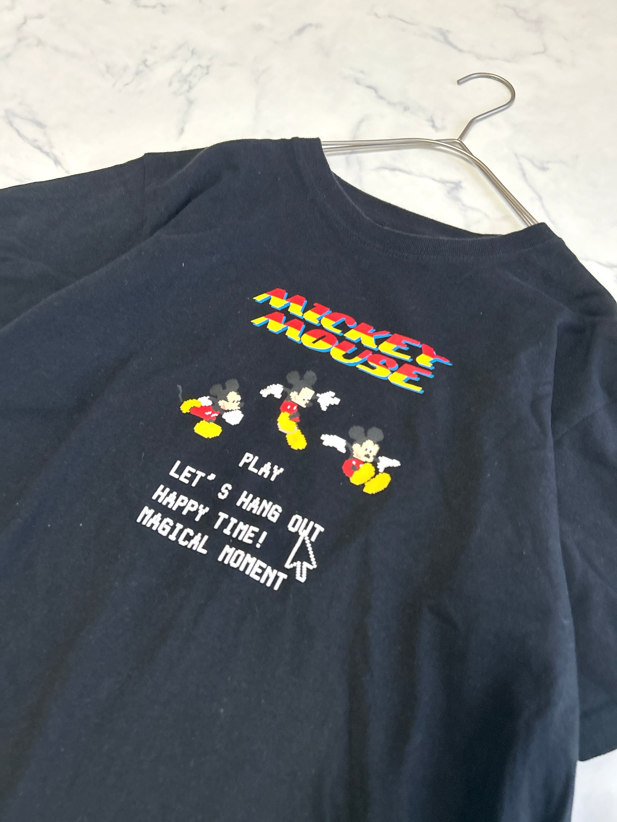 ドットなミッキーTシャツ 肩幅42cm 身幅50cm 着丈60cm 昔のファミコンみたいなミッキーTシャツ タグが切れてサイズがわからないのですが Mくらいかと思います。