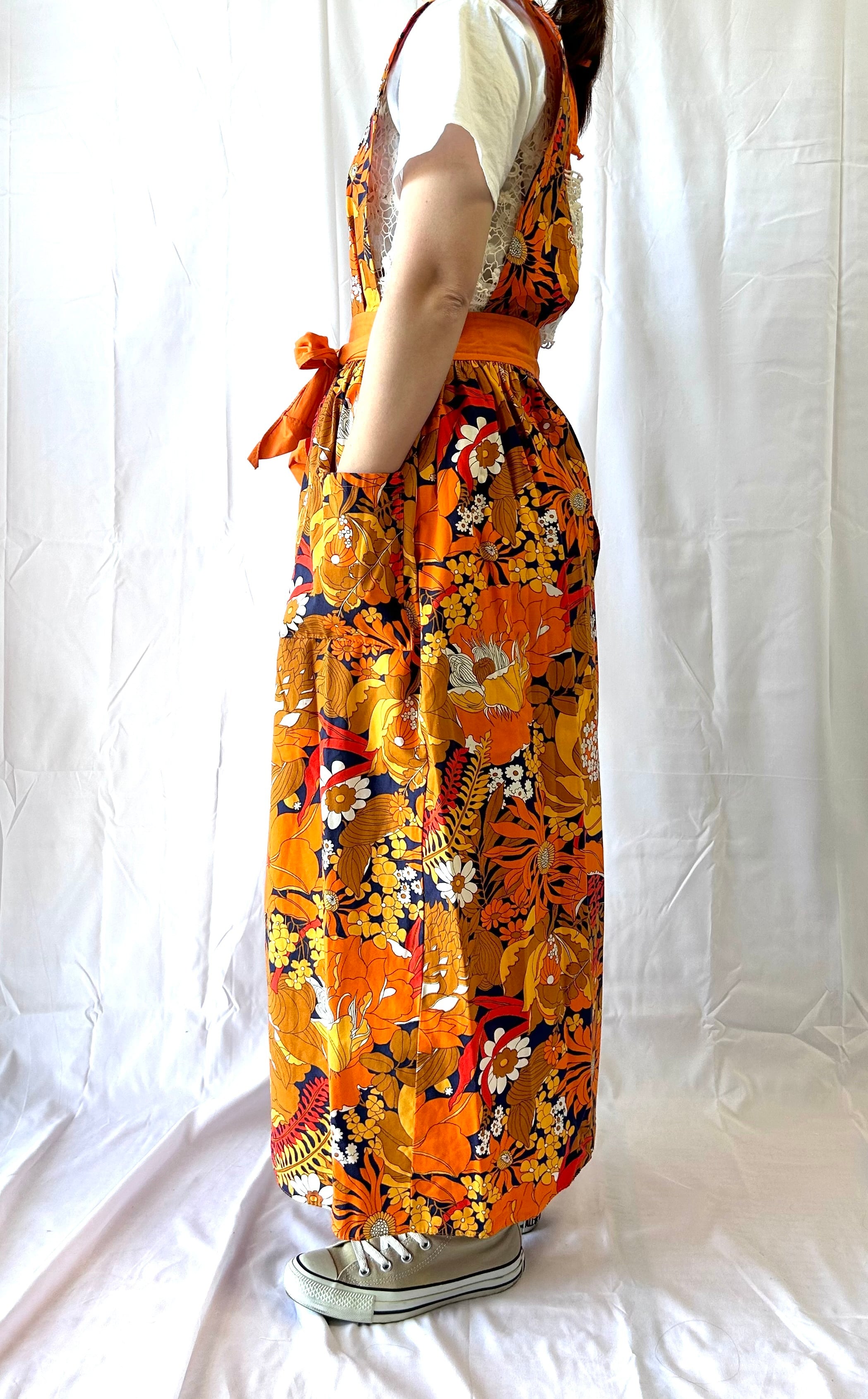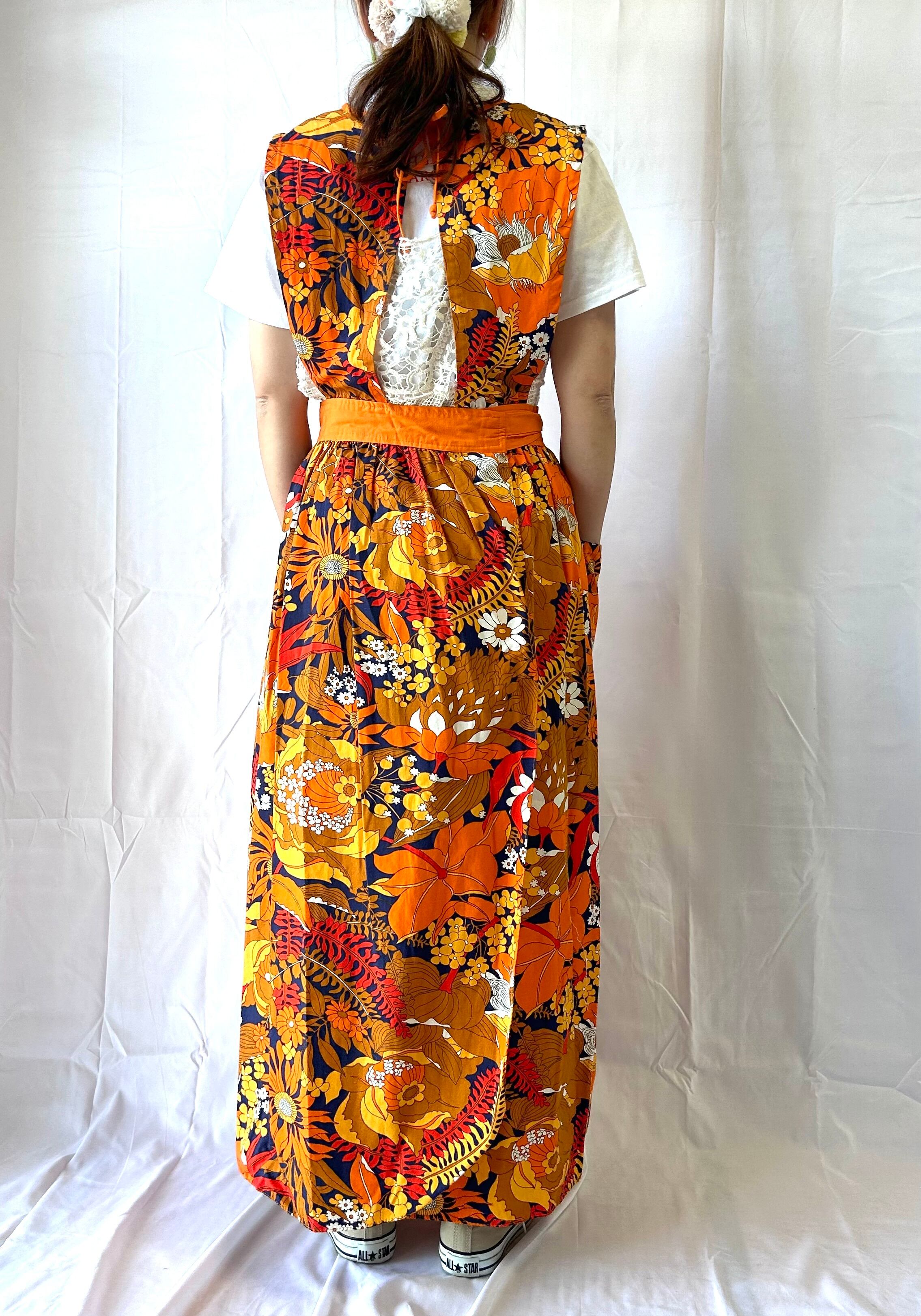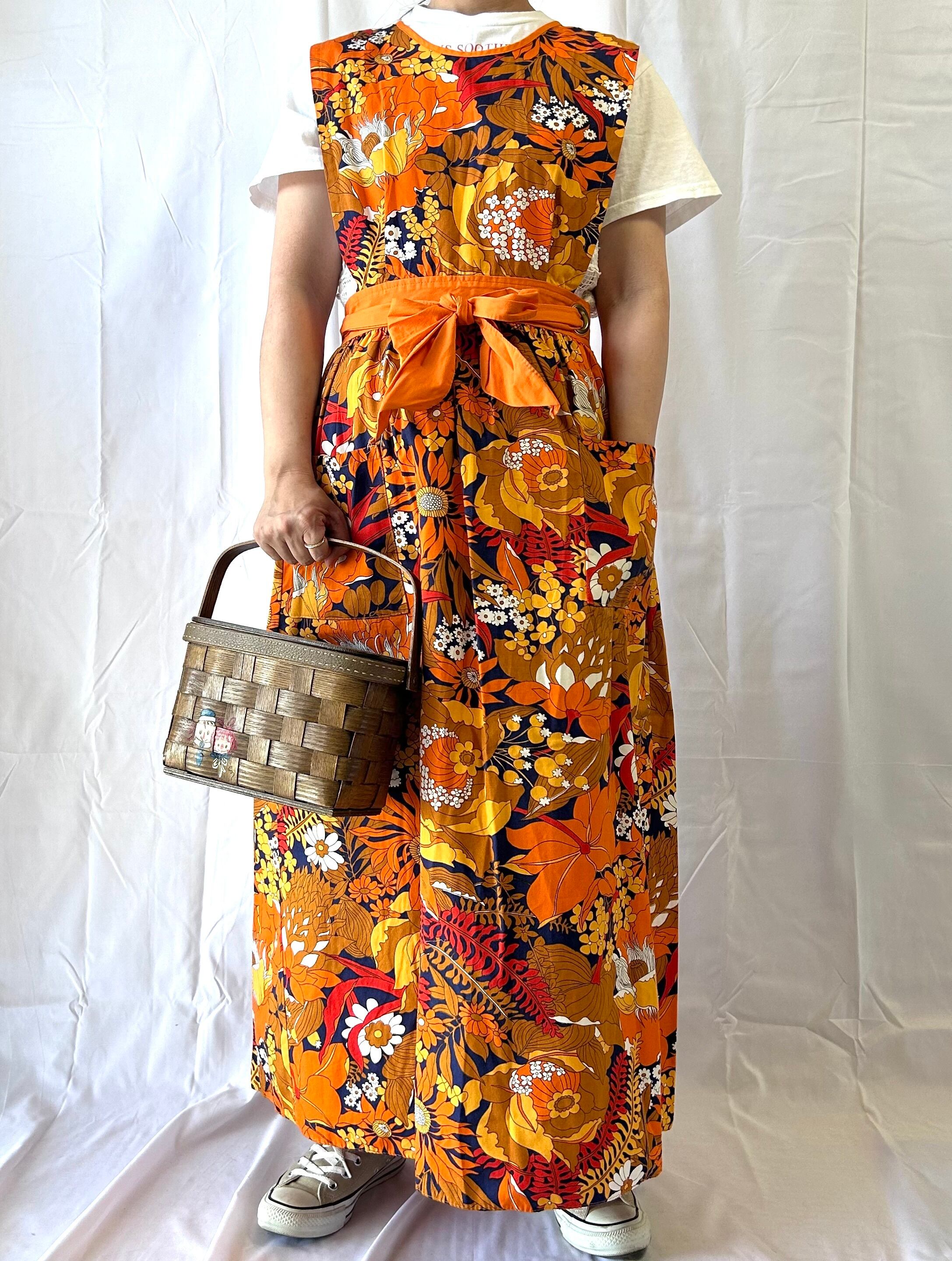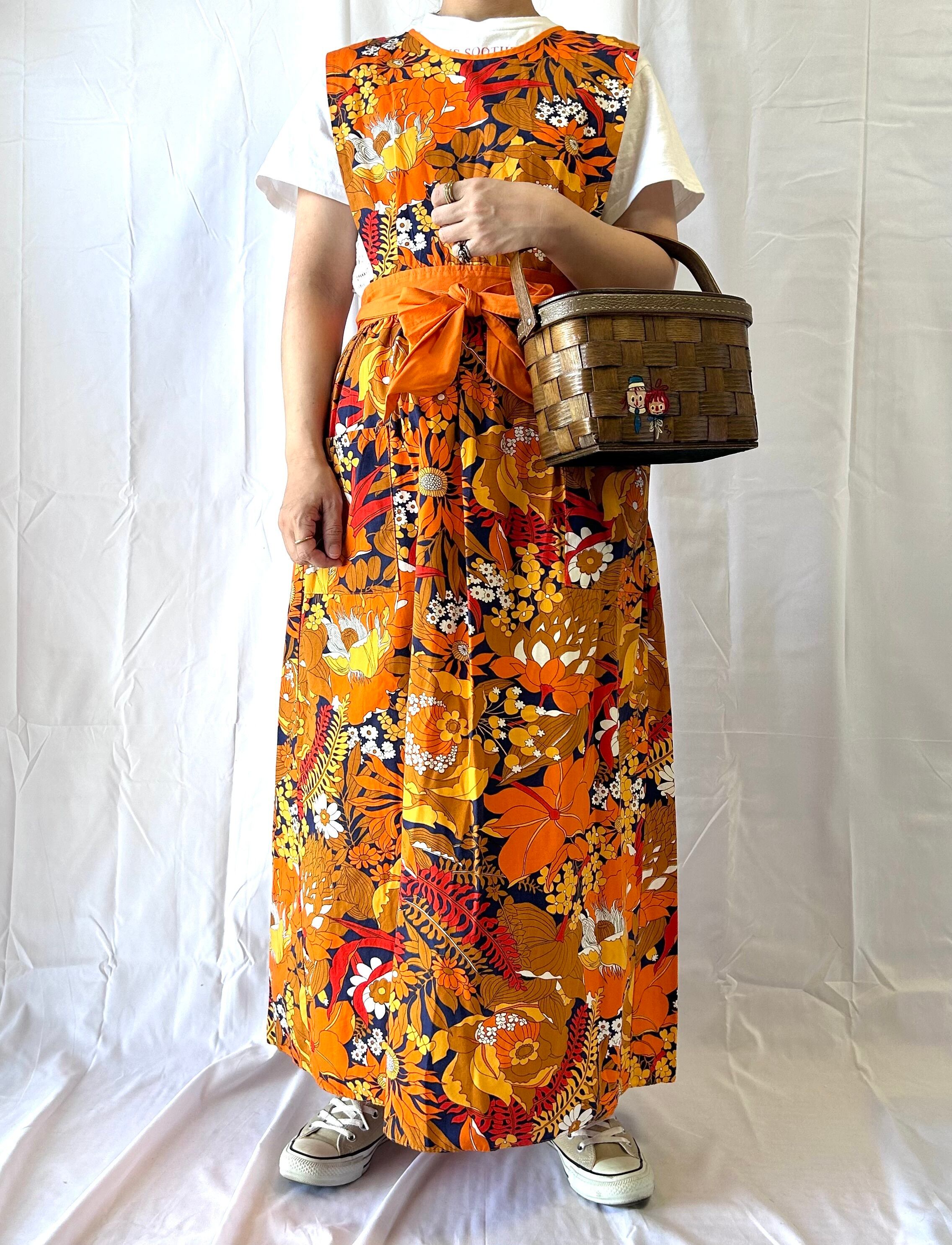 パッチワークプリントのヴィンテージエプロンワンピース。