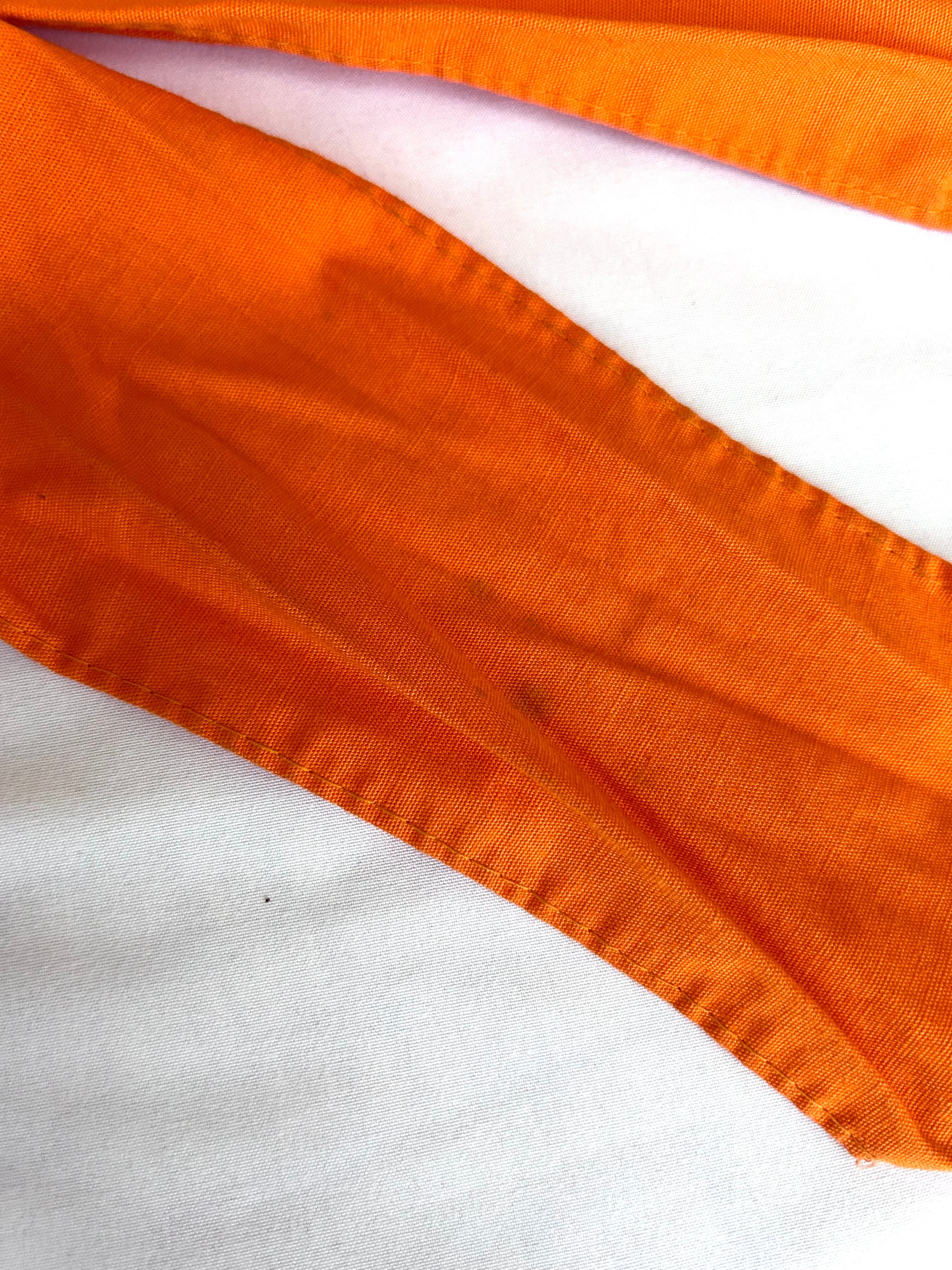 巻きスカートのようにグルッと巻いて、左サイドに通し穴のハトメリングが付いています。そこを通して前でリボン結びをします。