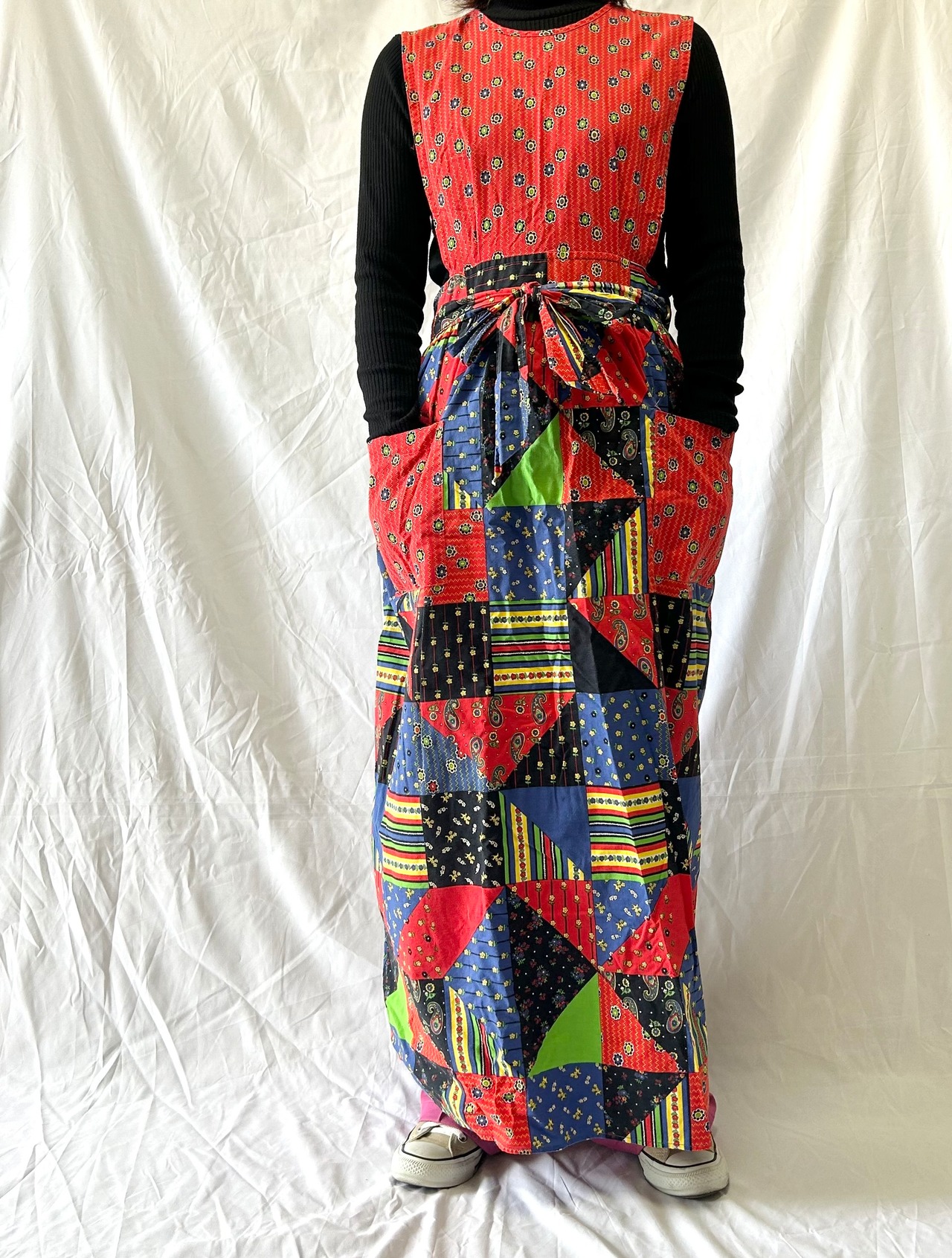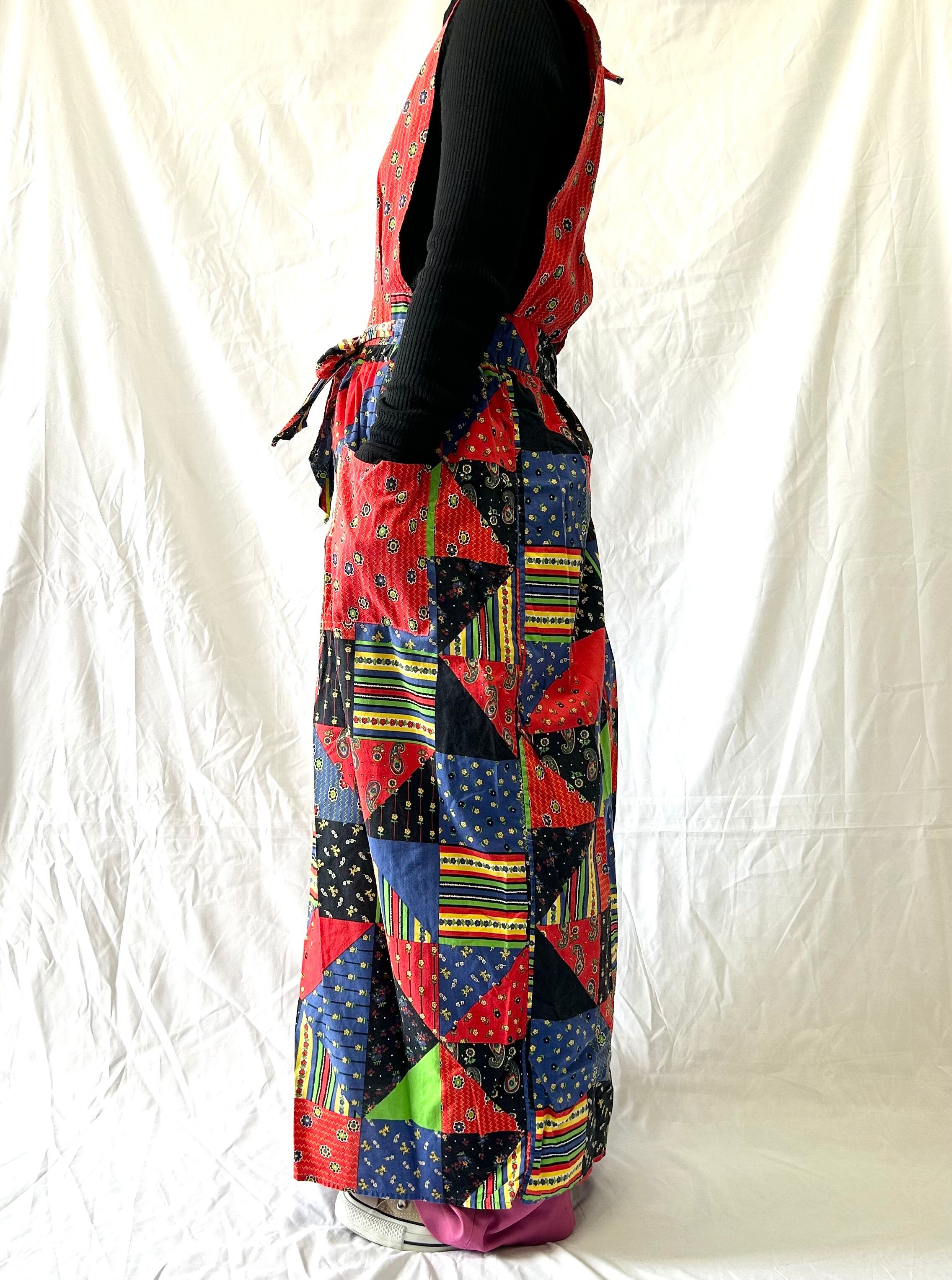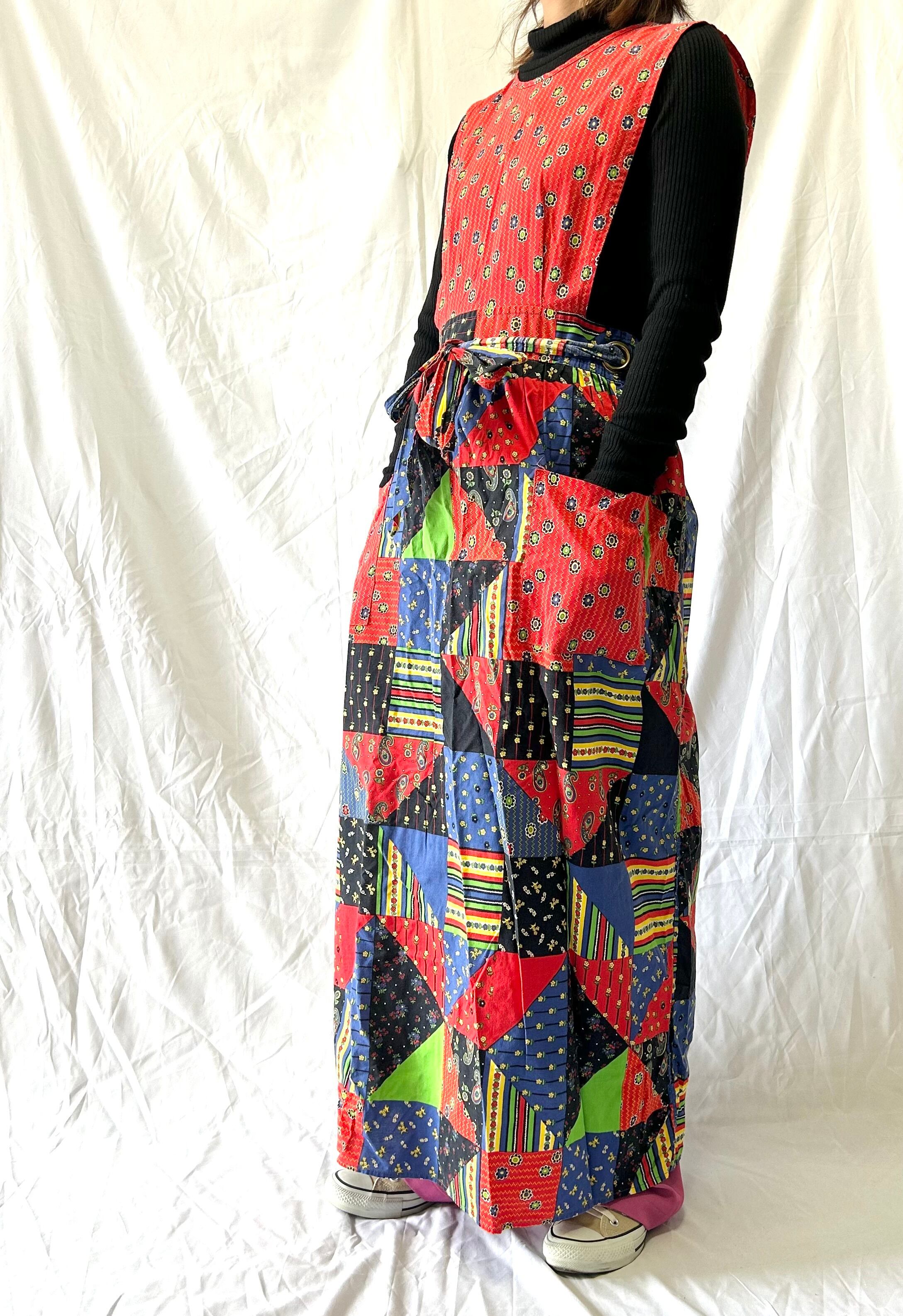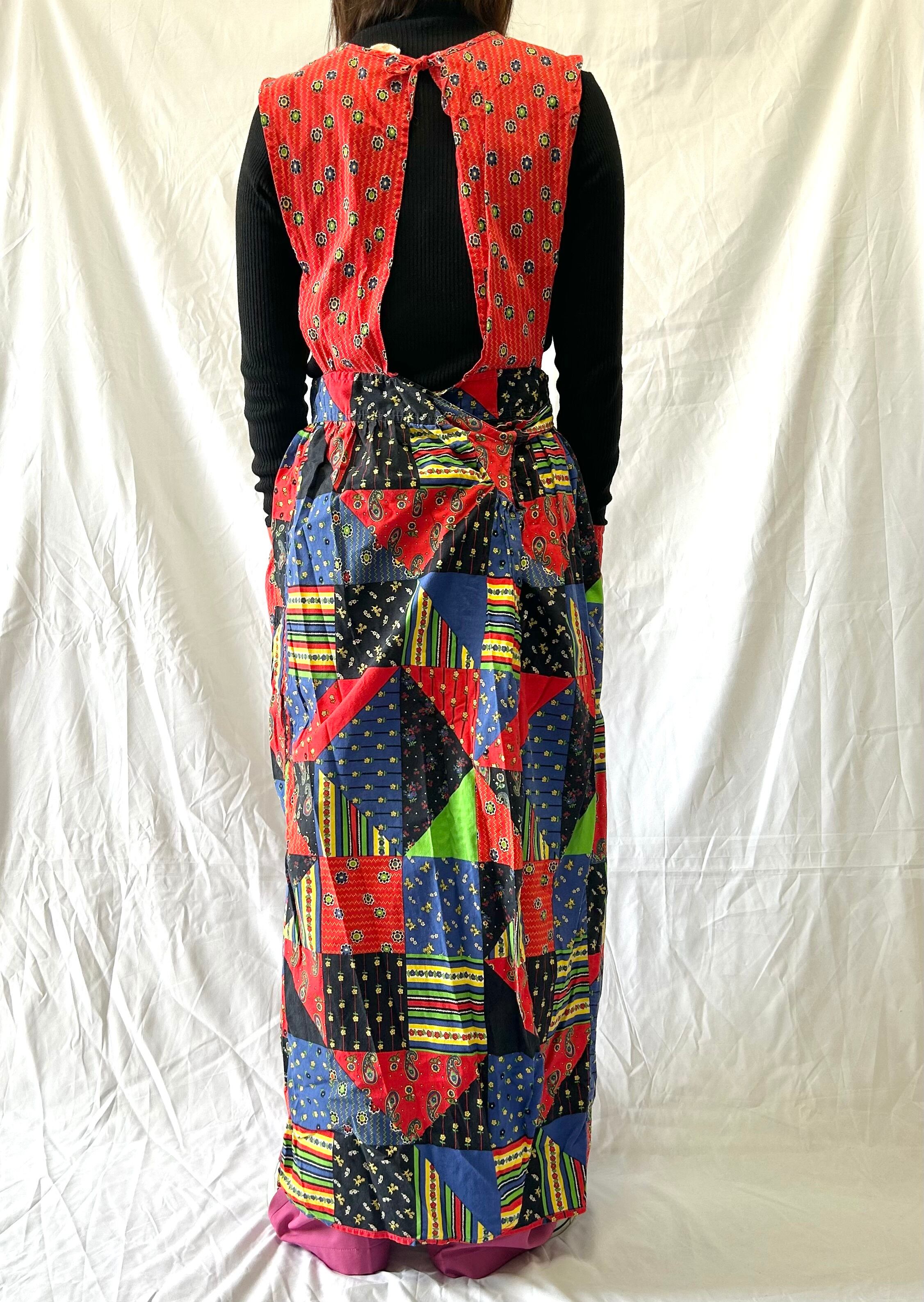 パッチワークプリントのヴィンテージエプロンワンピース。