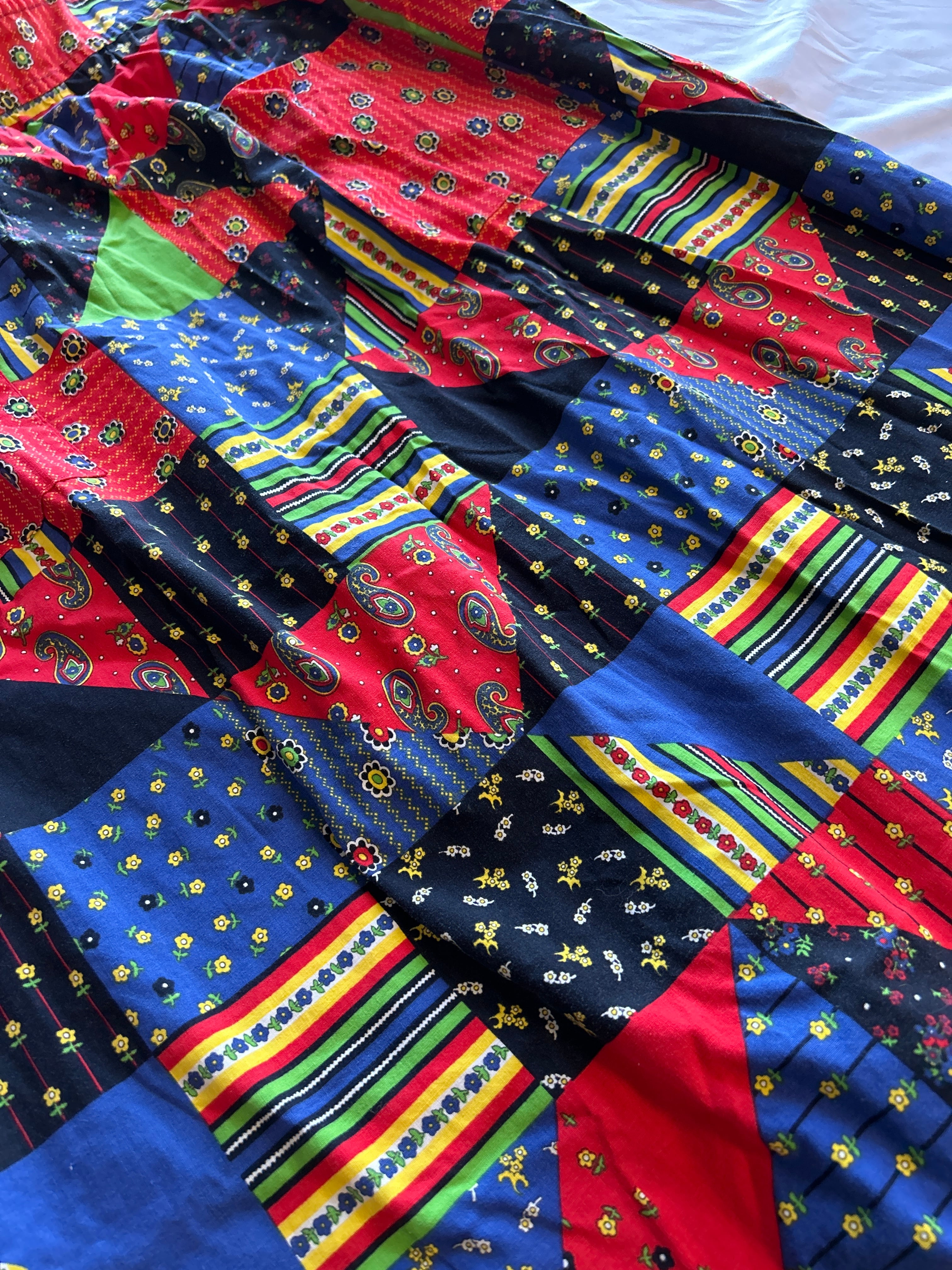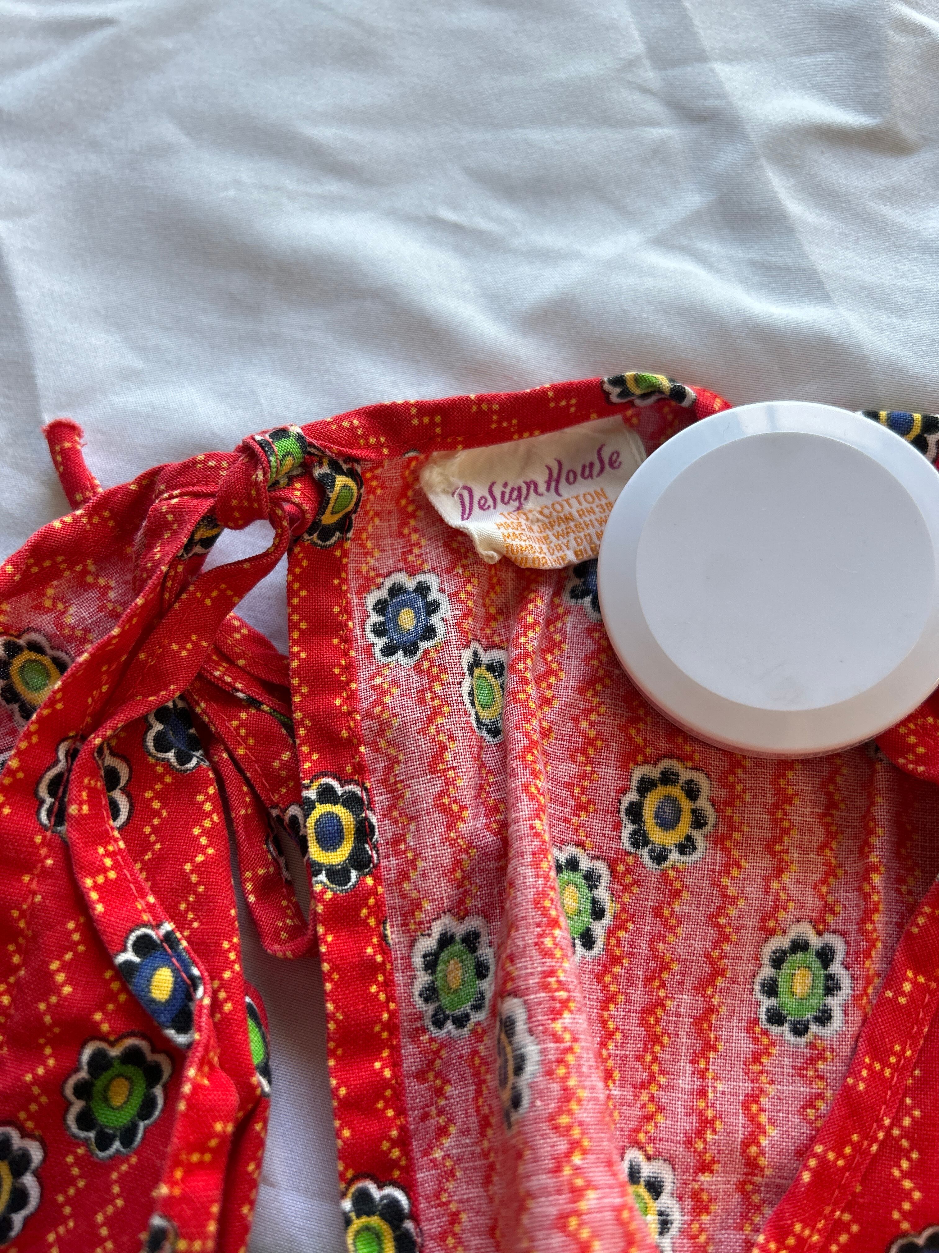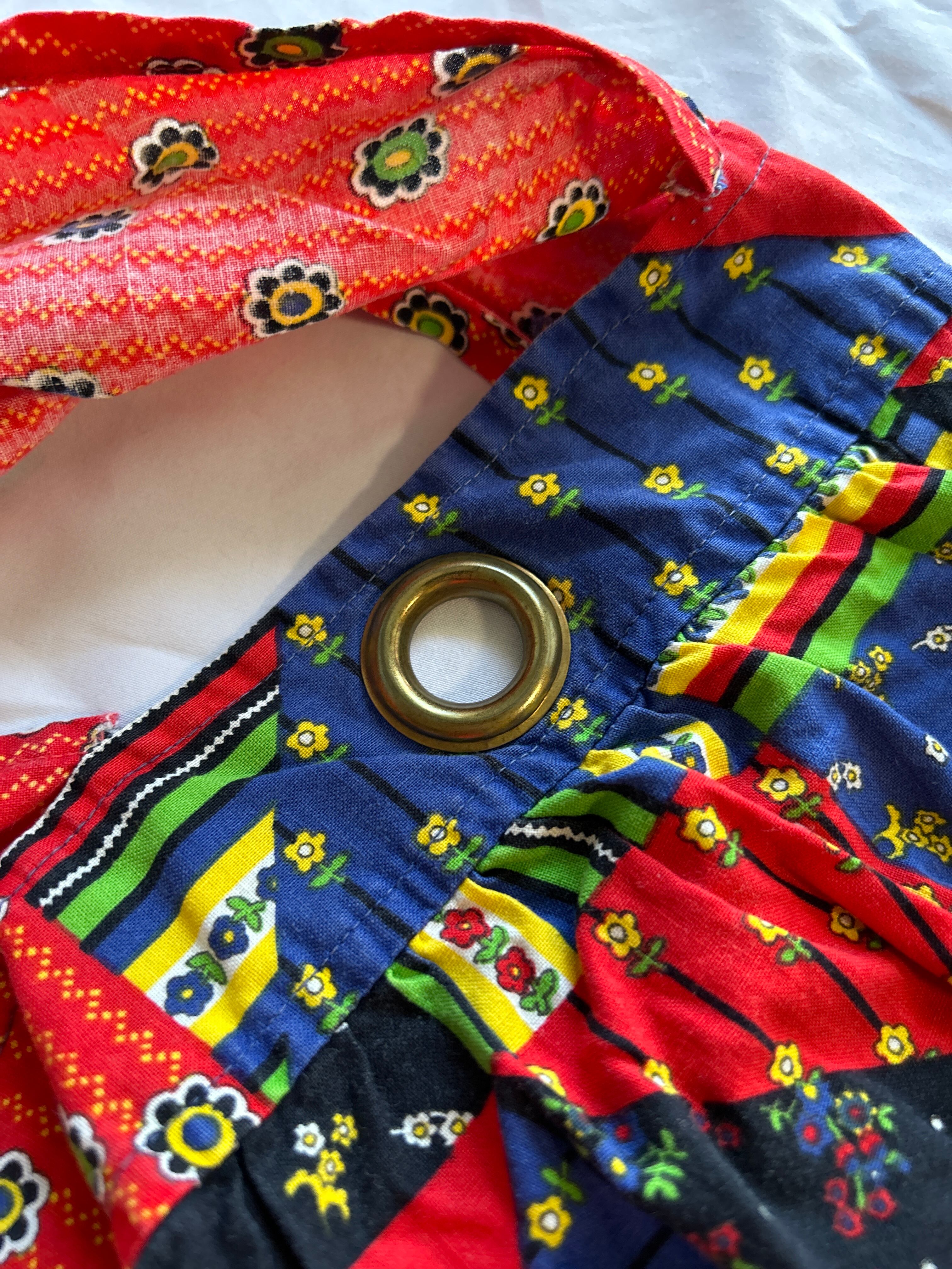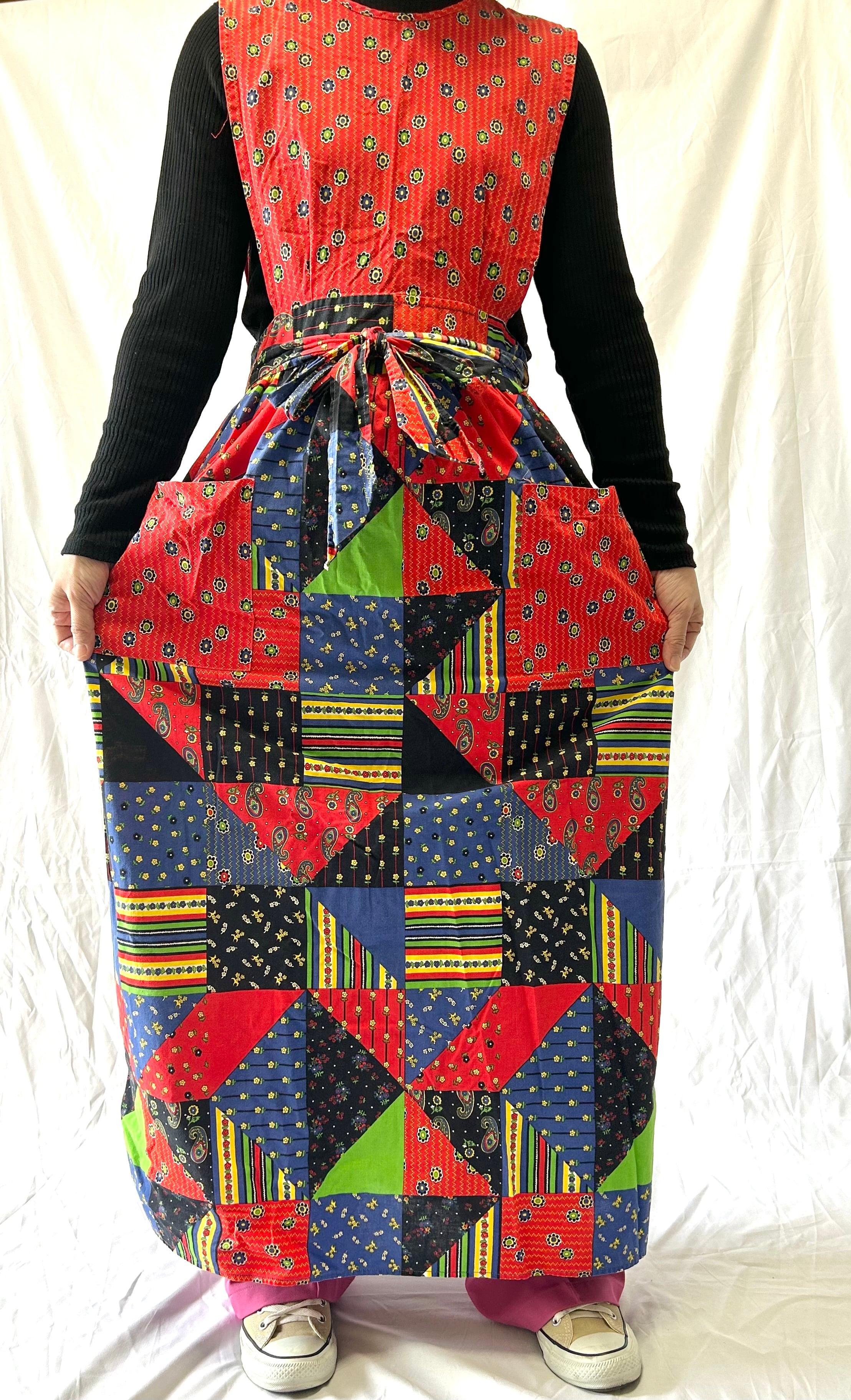 パッチワークプリントのヴィンテージエプロンワンピース。